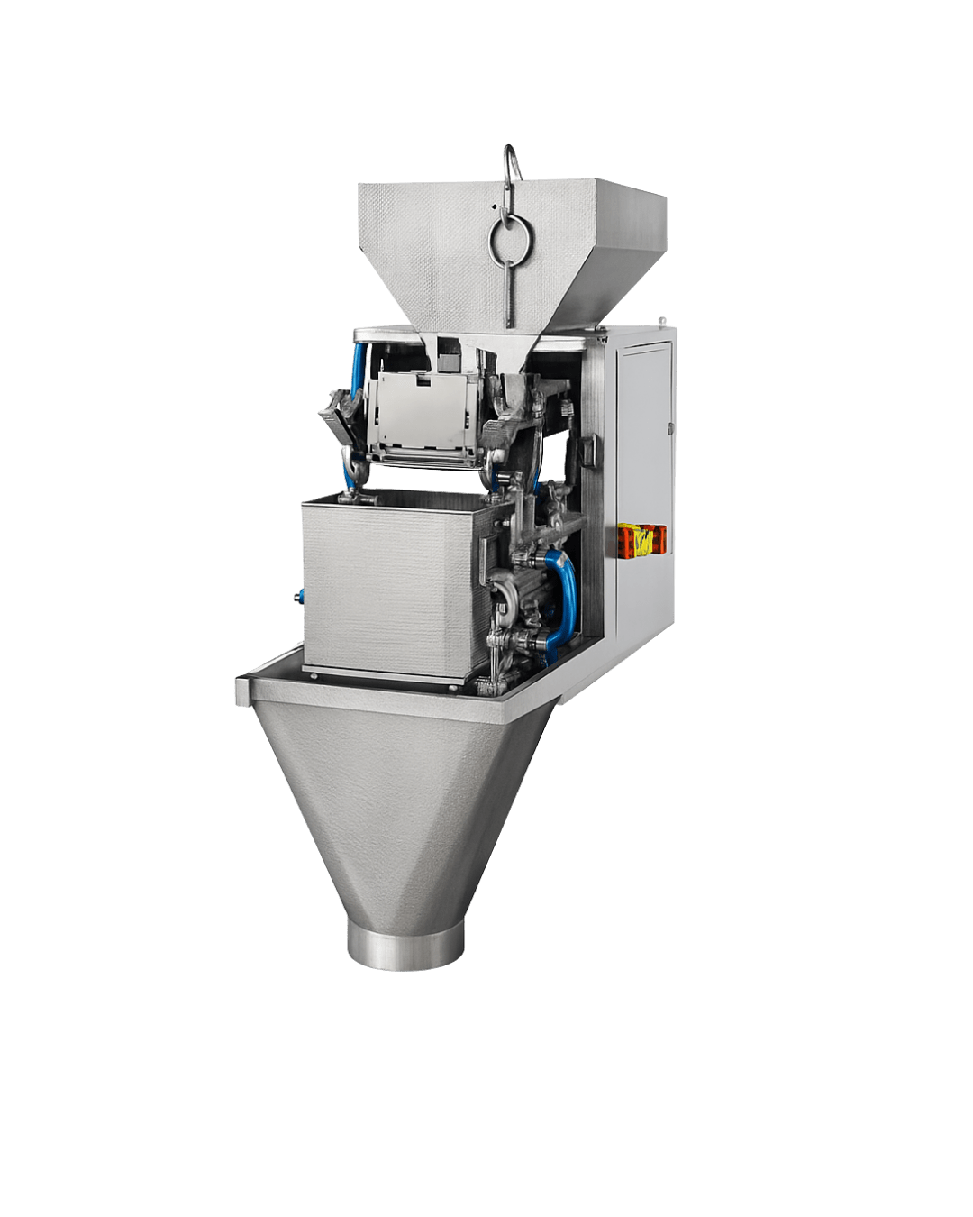 free-flowing solid products. Using a precision load cell system, the machine weighs the product and dispenses